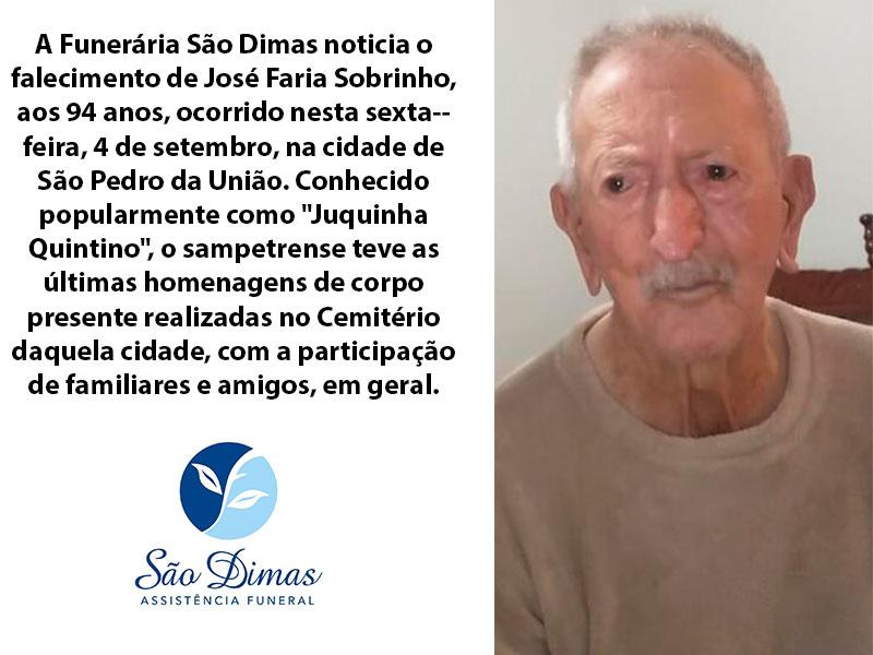 A Funerária São Dimas noticia o falecimento de José Faria Sobrinho, aos 94 anos, ocorrido nesta sexta-feira, 4 de setembro, na cidade de São Pedro da União. Conhecido popularmente como "Juquinha Quintino", o sampetrense teve as últimas homenagens de corpo presente realizadas no Cemitério daquela cidade, com a participação de familiares e amigos, em geral.