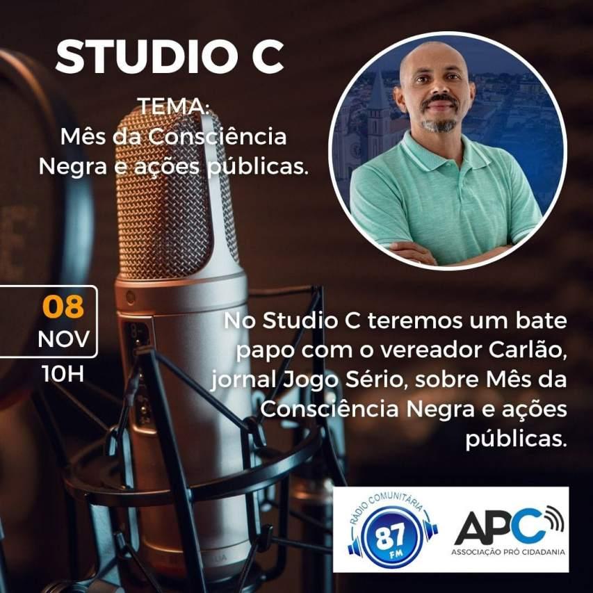 O vereador e repórter Carlão, do Jornal JOGO SÉRIO, de Guaxupé, no Sudoeste mineiro, será o entrevistado deste sábado, 8 de novembro, do "Studio C", conduzido por Neide Barbosa, na Rádio Comunitária - 87FM Guaxupé. A participação do legislador em questão começará às 10 horas, a partir de quando o convidado falará sobre vários temas, com ênfase ao Mês da Consciência Negra, atos de parlamentares em níveis municipal, estadual e federal, assim como outros assuntos. Acompanhe no link à frente: https://youtube.com/@87fmguaxupe.?si=YKDrgr6suQxIRwX1 - - AJUDE O jornal que lhe informa a todos os momentos: faça um PIX de qualquer valor para 11.086.919/0001-66. - CLIQUE AQUI e receba os conteúdos do JOGO SÉRIO em seu whatsapp. - NESSE LINK, você passa a seguir a nova fanpage/facebook Jornal JOGO SÉRIO. - A QUALQUER instante, acesse www.jornaljogoserio.com.br e fique muito bem informado.