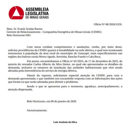 Ainda sobre o assunto, o deputado Luizinho oficiou o gerente de Relacionamento da CEMIG, Evanir Araújo Bueno, a quem transmitiu a demanda e deixou claro que o tema deverá ser resolvido da melhor forma, em favor do bem coletivo: “Em anexo, encaminhamos o Ofício nº 62/2025, de 17 de dezembro de 2025, de autoria do vereador Carlos Alberto da Silva Júnior, no qual são apresentados os detalhes da demanda, inclusive os números de instalação das unidades habitacionais que vêm sendo afetadas pela intermitência do serviço de energia elétrica. Diante do exposto, solicitamos especial atenção da CEMIG para com a demanda apresentada; e que também nos encaminhe resposta com as informações das ações que foram ou que serão adotadas para dirimir o problema”, solicitou o deputado Luizinho.