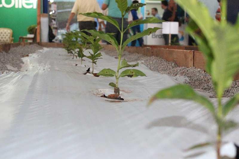 Pela primeira vez na Feira do Cerrado, o uso de Mulching na cafeicultura foi apresentado. Trata-se de uma lona de filme plástico que cobre o solo, apresentando entre os resultados a redução de custos com capinas e aplicações de herbicidas.
