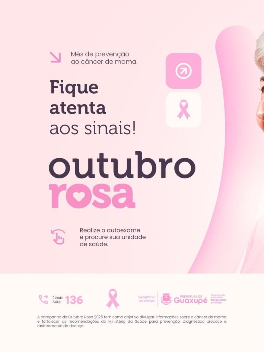 A Prefeitura de Guaxupé, por meio da Secretaria Municipal de Saúde, preparou uma série de atividades durante todo o mês de outubro em referência ao Outubro Rosa, campanha mundial de conscientização sobre a prevenção e o diagnóstico precoce do câncer de mama.