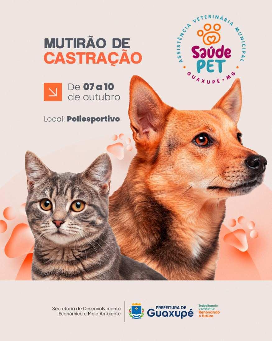 A Prefeitura de Guaxupé promove, entre os dias 7 e 10 de outubro, mais uma edição do Mutirão de Castração, por meio do programa Saúde Pet, coordenado pela Secretaria de Desenvolvimento Econômico e Meio Ambiente. A iniciativa acontece no Poliesportivo e tem como objetivo garantir o controle populacional e o cuidado responsável com cães e gatos do município.