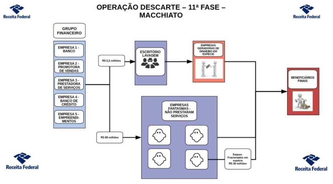 Além disso, em fiscalização posterior, Auditores-Fiscais da Receita Federal identificaram que várias empresas do conglomerado fizeram pagamentos milionários por serviços que jamais foram prestados. Uma das empresas que recebeu recursos do grupo financeiro sacou, em espécie e de forma fracionada, cerca de R$ 38 milhões. Confira o infográfico da Operação Macchiato em anexo.