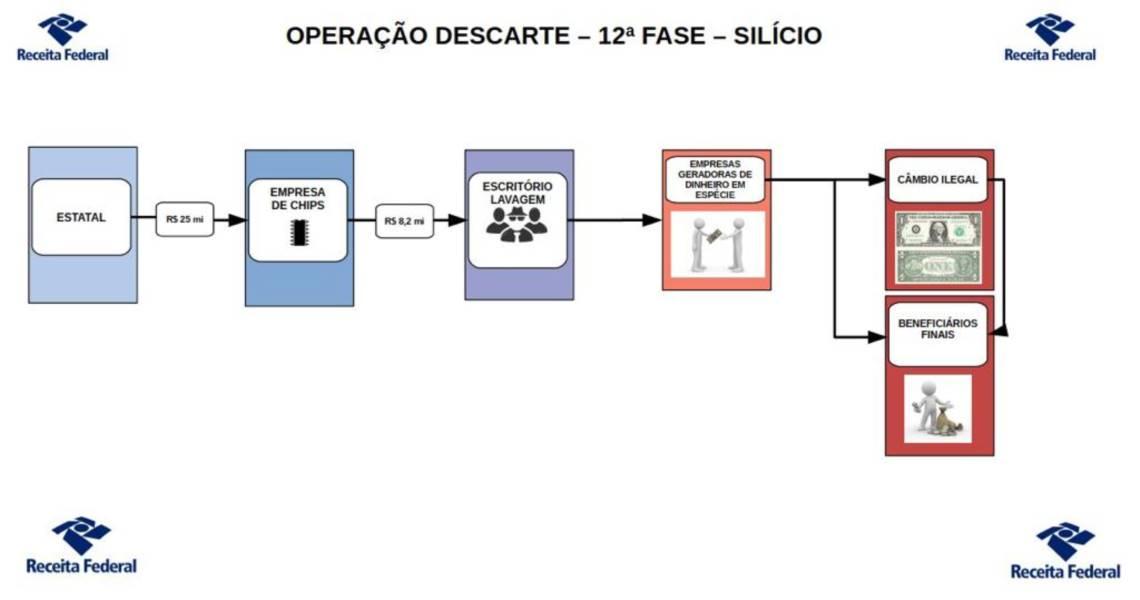 Já na Operação “SILÍCIO”, são investigadas vendas supostamente superfaturadas realizadas pelo mesmo empresário do setor de componentes eletrônicos a uma empresa estatal. Para realizar essas vendas, esse empresário teria se utilizado de empresas fantasmas controladas pela organização criminosa objeto da primeira fase da Operação Descarte. Os Auditores-Fiscais da Receita Federal detectaram R$ 8,2 milhões em notas fiscais fraudulentas, valor que teria sido pago ao escritório de lavagem. O nome dessa fase remete aos produtos envolvidos nessa operação. Veja o infográfico da Operação Silício em anexo.