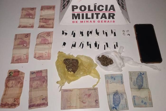 O menino foi visualizado por patrulheiros da 79ª Cia. PMMG em comportamento estranho, tendo as autoridades se aproximado, quando ele tentou, mas foi impedido, engolir quatro pedras de crack. Em suas vestimentas, conforme a polícia, foram encontrados R$ 64,00 em dinheiro e um aparelho celular. Já nas proximidades, os PMs localizaram vinte e sete papelotes de cocaína e duas porções pequenas de maconha, cujos produtos estavam sob poder do abordado.
